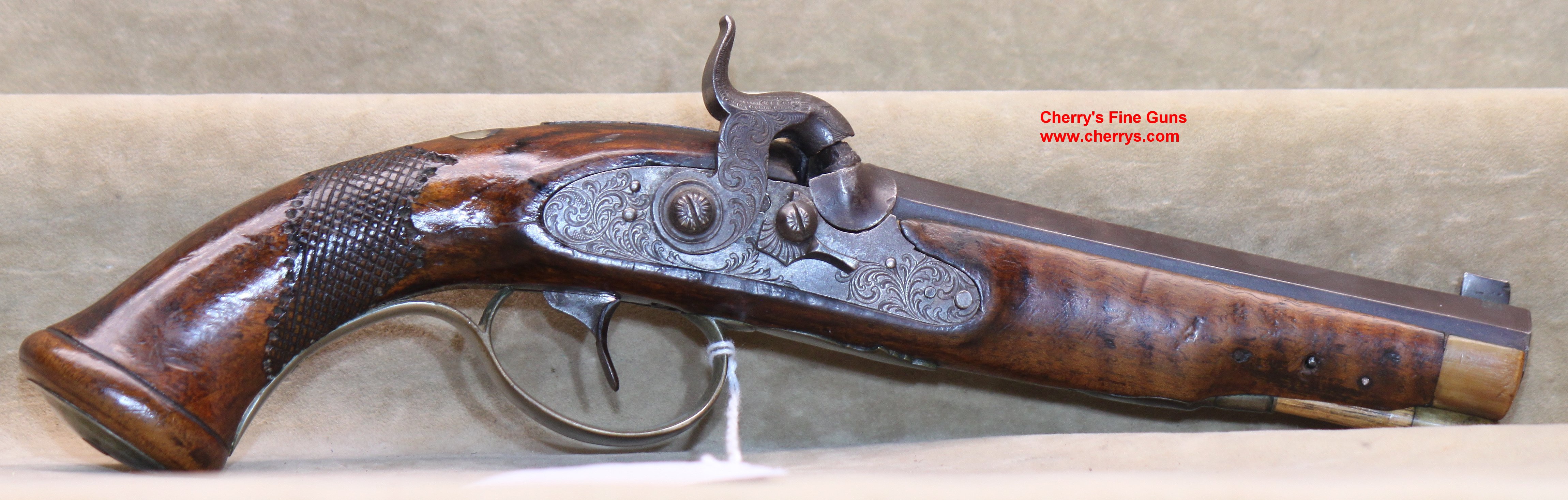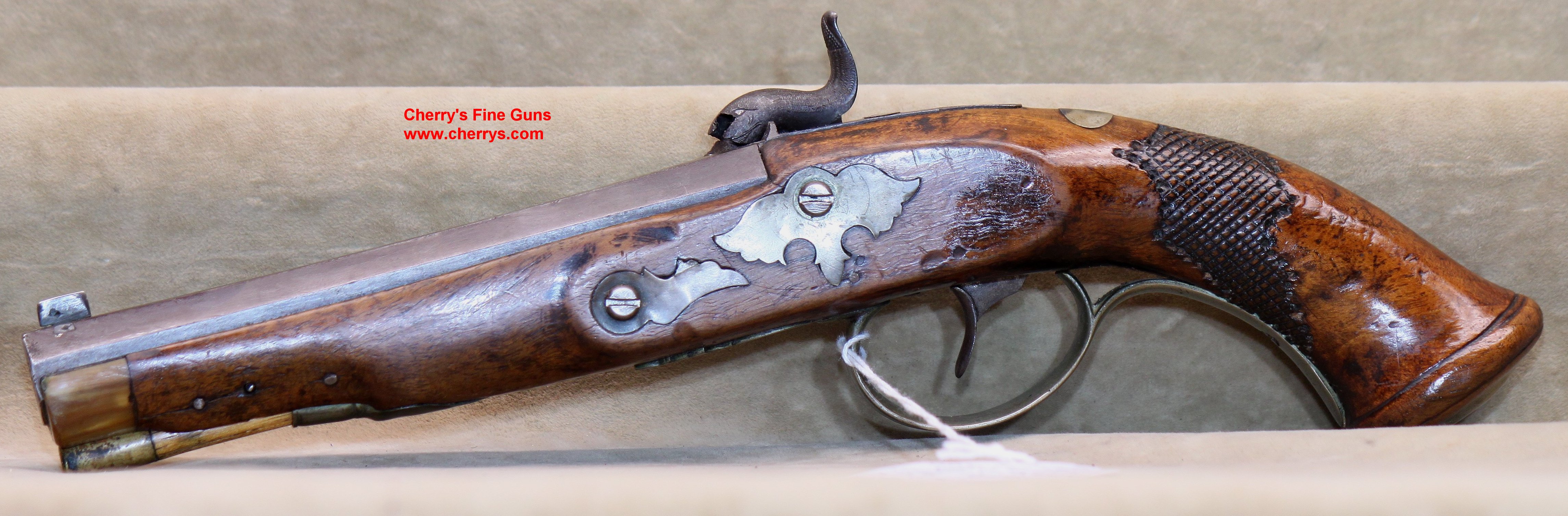 | 100579BRU | Christian Korber Of Ingelfingen Percussion Pistol, .48 Bore With 6 1/8" Barrel, Barrel Inlaid With Silver, All Hardware German Silver, Lock And Hammer Engraved, Manual Safety, Good Mechanics, Ramrod | $1,250.00 | 1,2,3 |